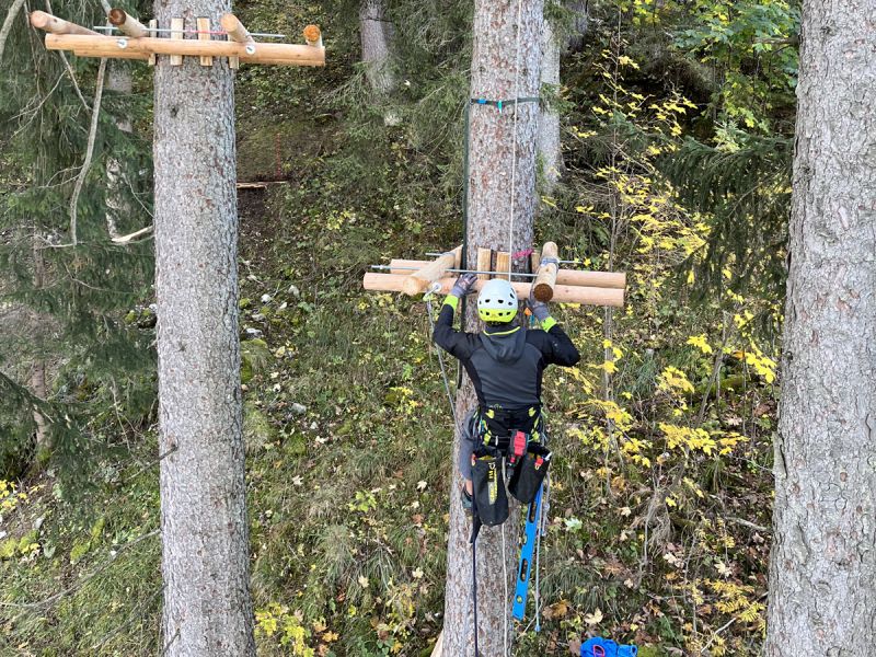 Fachlich qualifiziertes Personal im Holzbau mit der Zusatzqualifikation arbeiten mit Seiltechnik im und am Baum.
